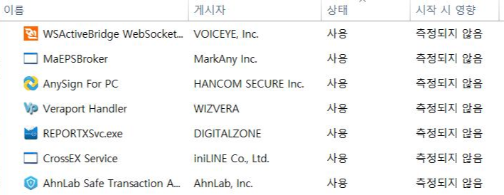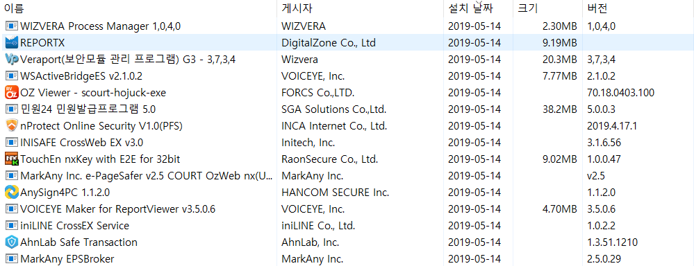 민원 뷰어/발급에서 부터 보안 프로그램 그리고 통합 설치 프로그램까지 총 15개가 설치되어있네요.