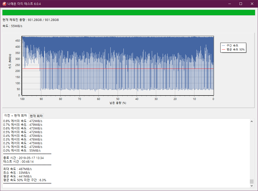 더티 테스트는 총 48분 14초 동안 진행되었으며 평균 414MB/s 속도지만