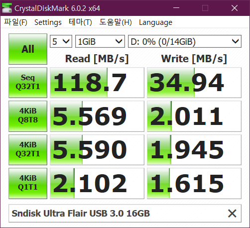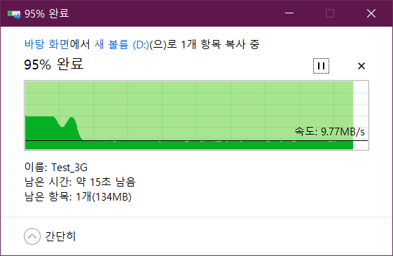 실제 쓰기 속도는 평균 9MB/s, 읽기 속도는 121MB/s 정도를 유지합니다.