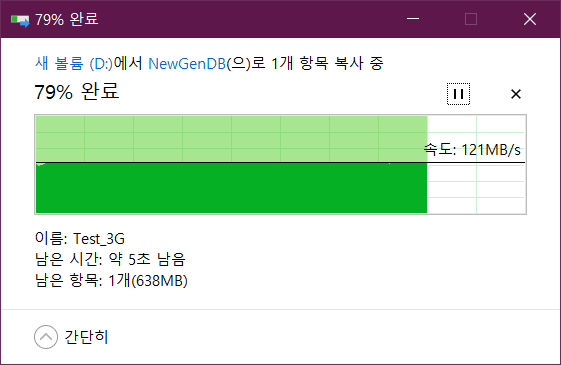 실제 쓰기 속도는 평균 9MB/s, 읽기 속도는 121MB/s 정도를 유지합니다.