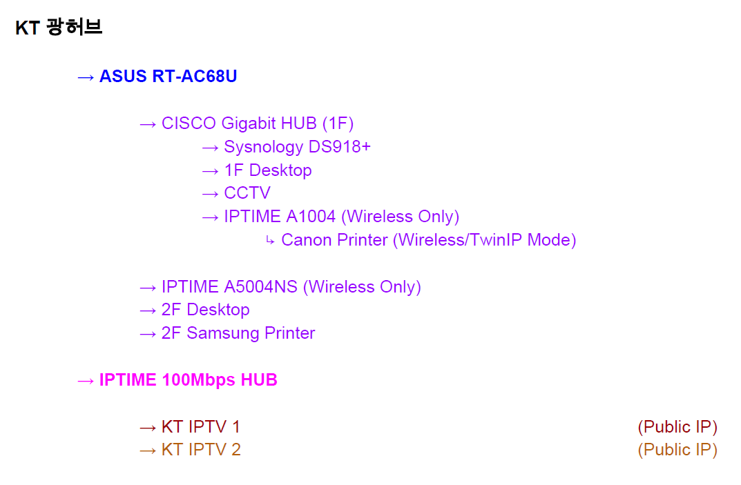 지금까지는 KT광허브를 통해 1층과 2층에 각각 공인 IP를 할당하여 층마다 따로 네트워크를 구축했습니다.
