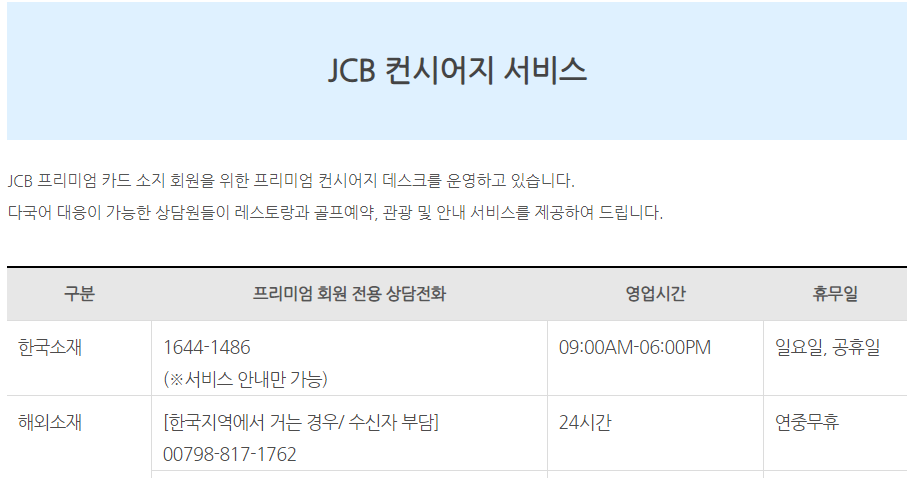 JCB컨시어지 서비스는 24시간 운영하며 수신자부담으로 위에 번호로 전화를 걸면 됩니다.