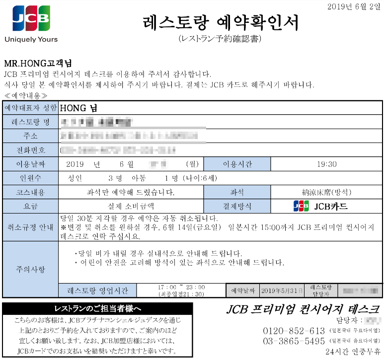 이번 달에 일본 여행을 가면서 JCB 컨시어지 서비스를 통해 식당 예약을 진행해보았습니다.