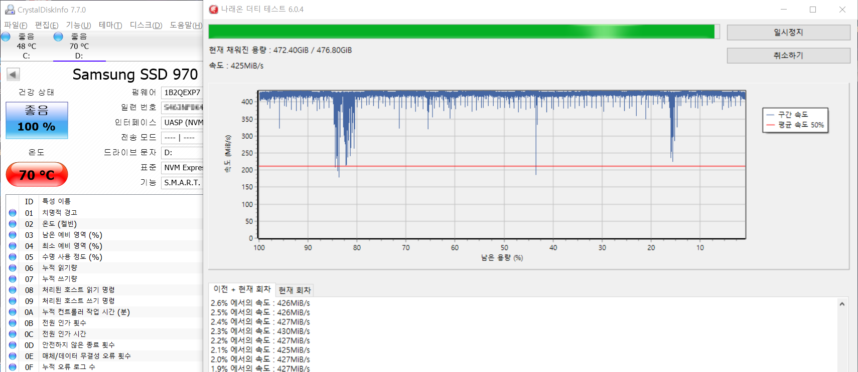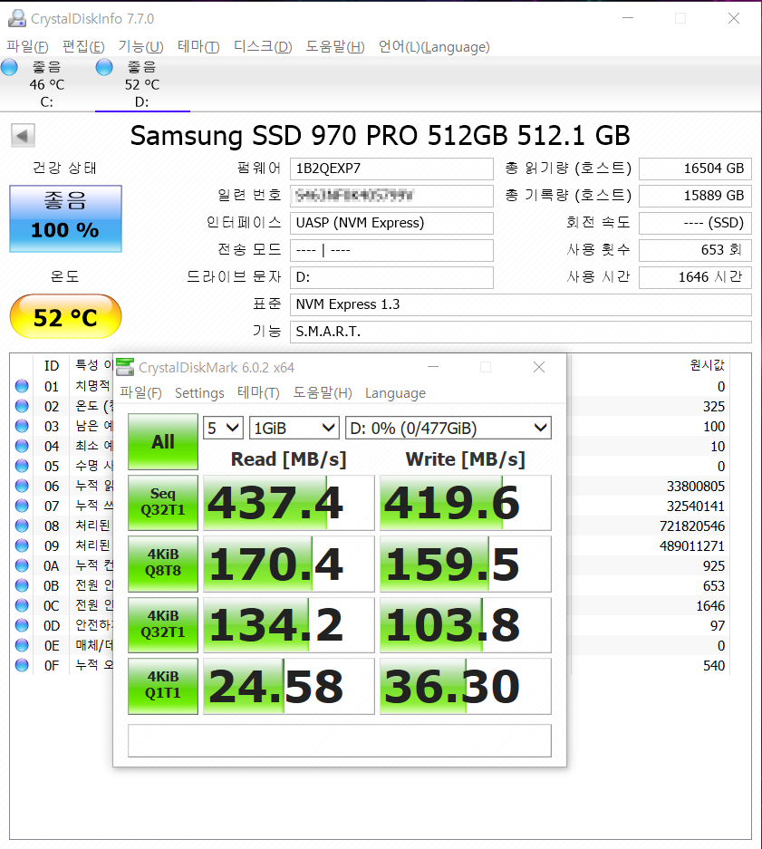 아이들 시 최대온도는 약 49'c를 유지하고 있으며 CDM을 한번 돌릴 경우 52'c 더디 테스트 한바퀴는 약 70'c까지