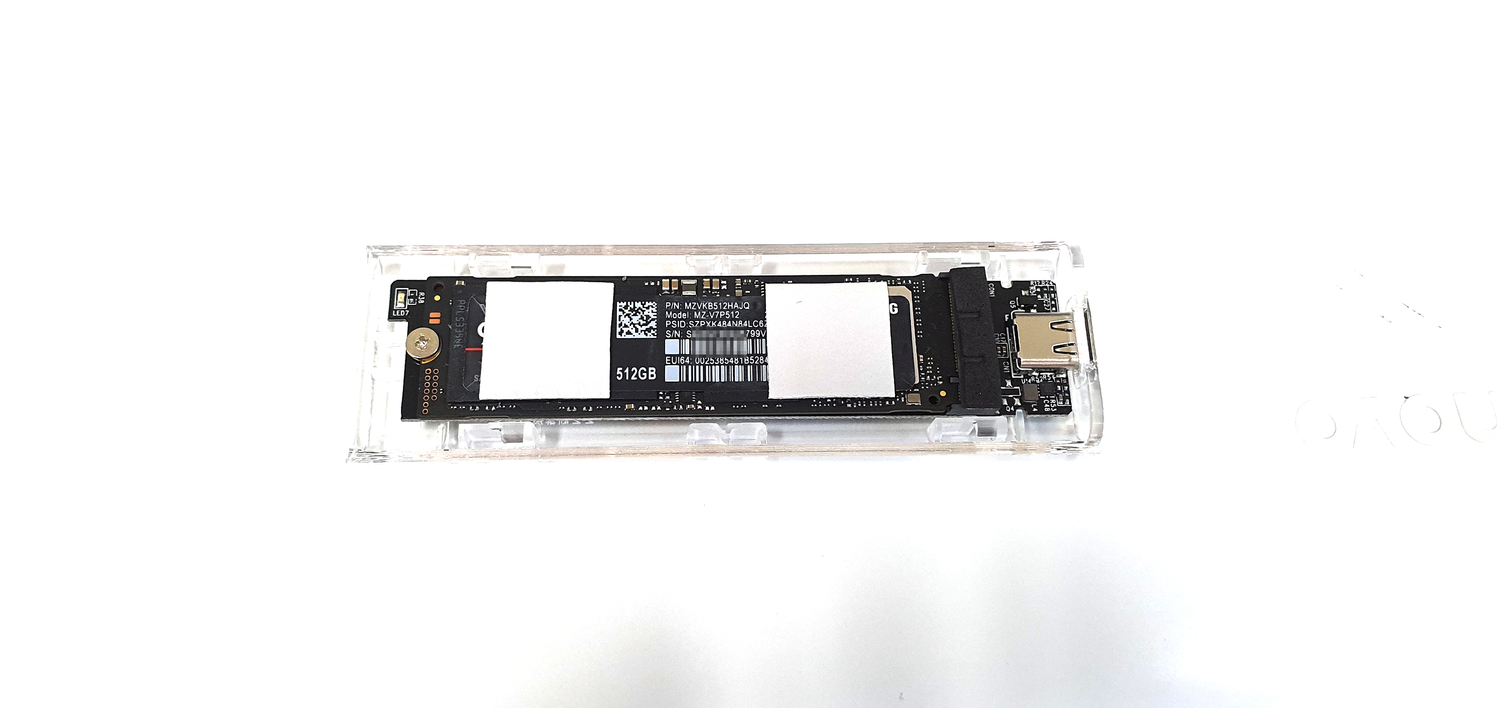 2개의 앞/뒤 플라스틱 하우징이 슬라이드 형태로 결합하는 상태이며 써멀패드 두께가 조금 작은 관계로