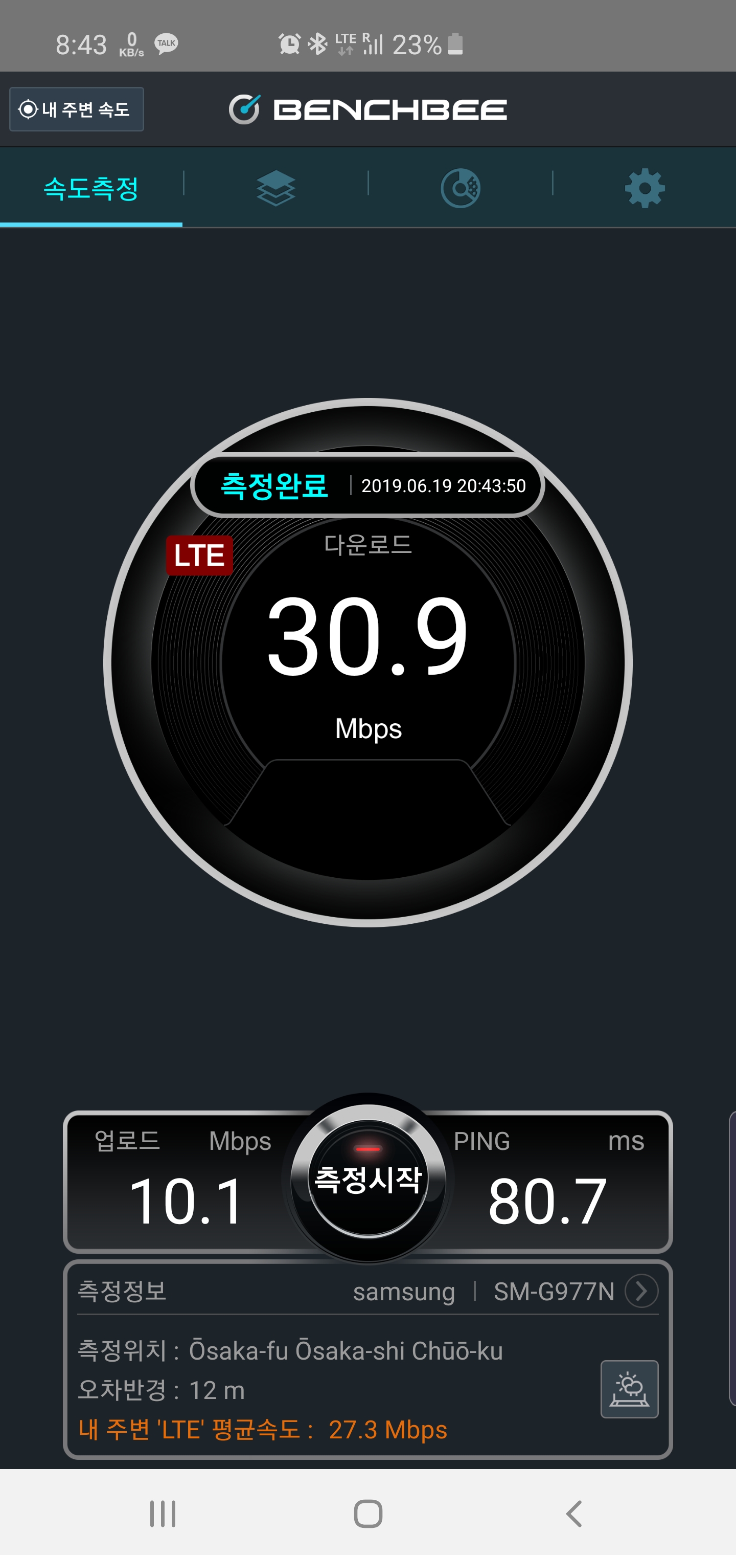 속도는 SoftBank 망 기준으로 핑 80ms, 다운로드 30 Mbps, 업로드 10 Mbps 정도 나왔습니다.