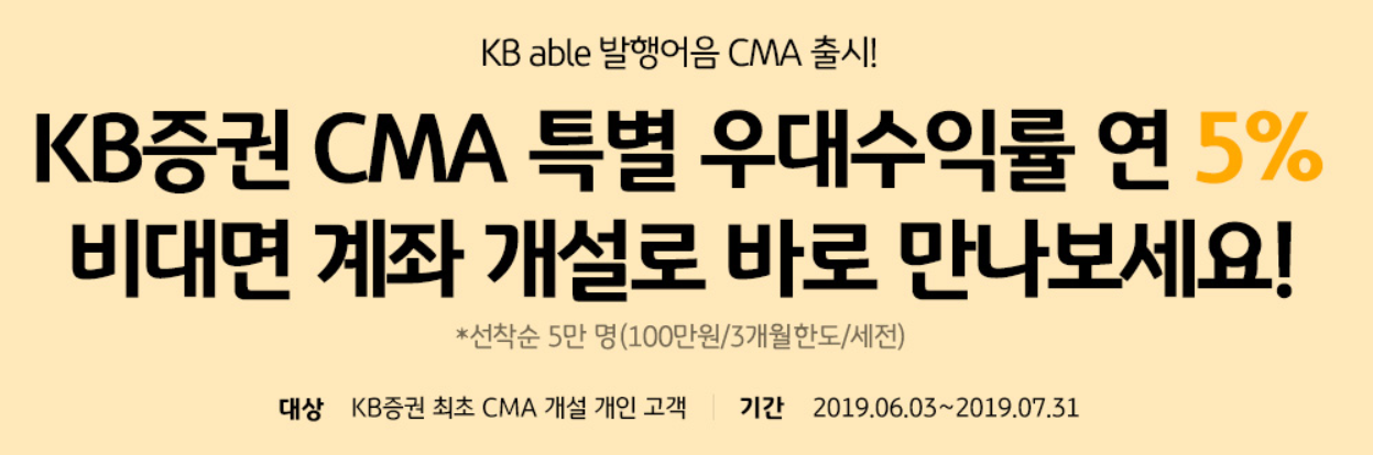 KB증권 신규 고객을 대상으로 KB able CMA 계좌에 연 5% 우대수익률과 주식수수료 10년간 무료 이벤트를 진행 중입니다.