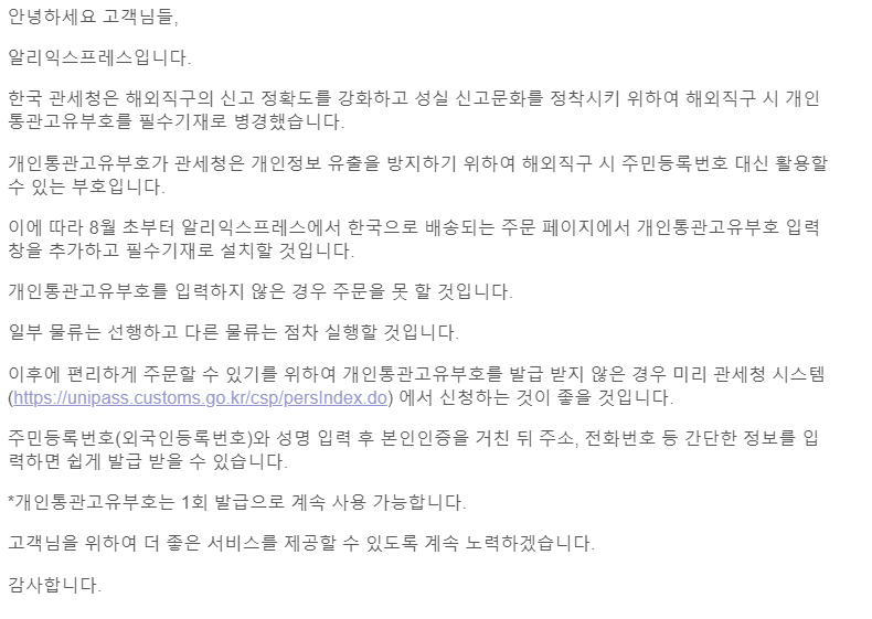 알리익스프레스는 한국으로 배송되는 주문건에 대해 개인통관 고유부호 입력을 의무화하겠다는 메일을 발송했습니다.