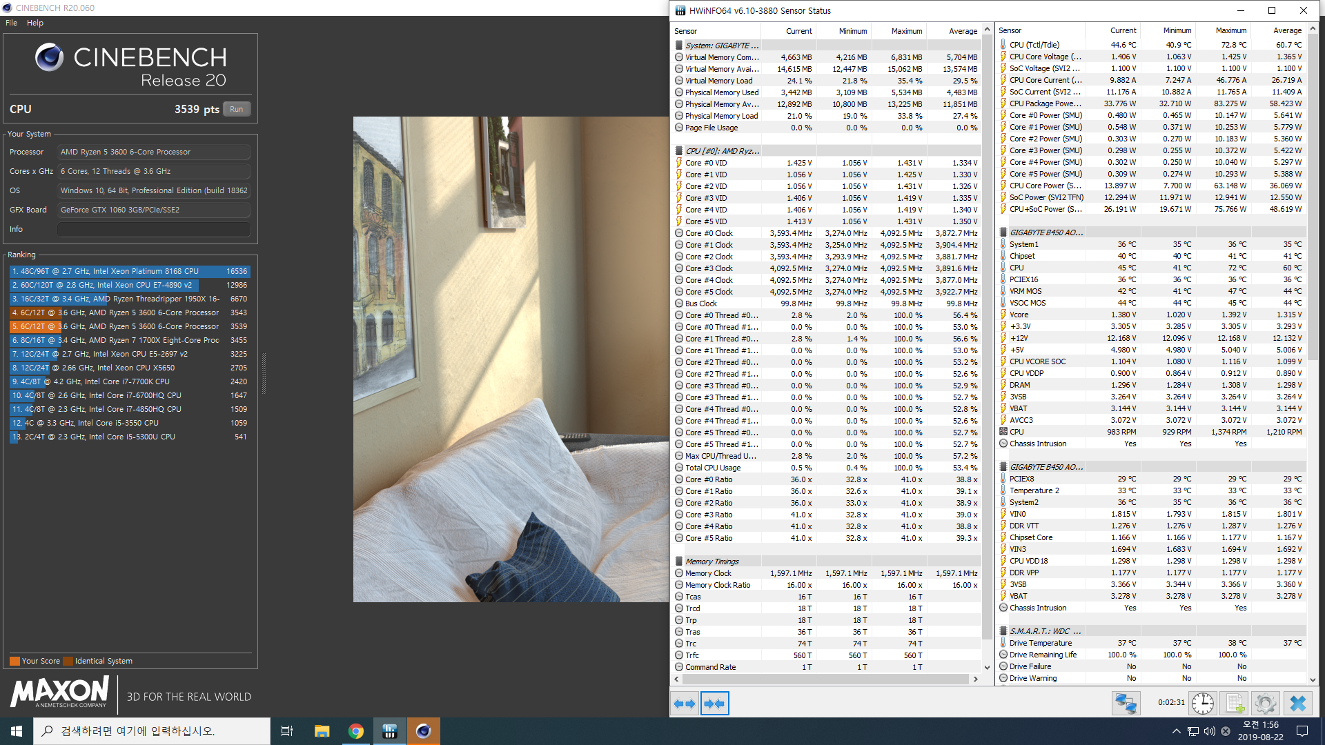 라이젠 3600, 16GB RAM, 1TB SSD, GTX 1060 3GB, B450, 500W 파워로 구성했습니다.