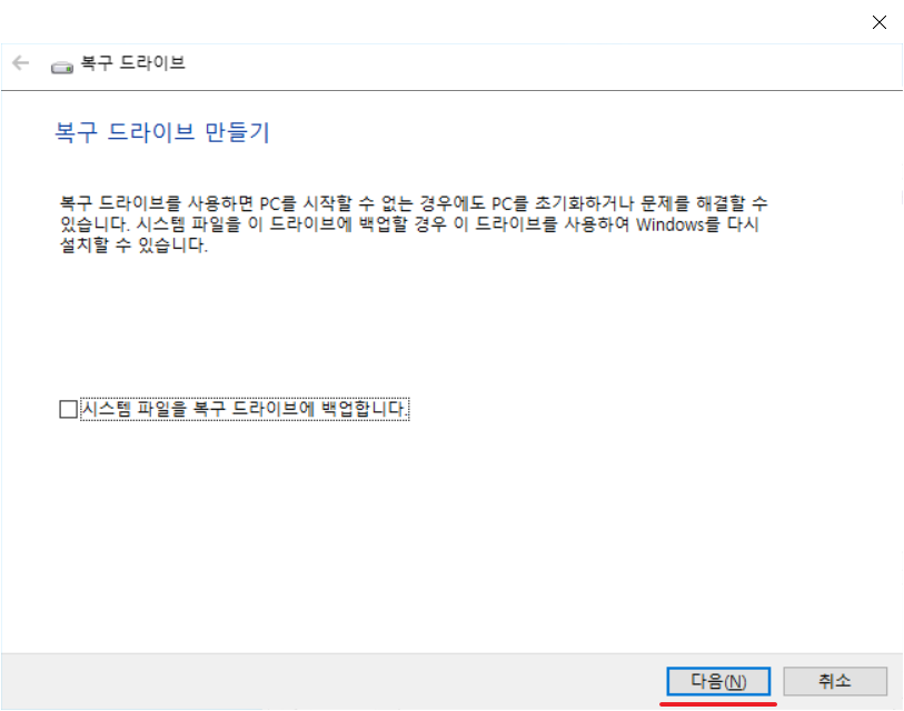 프로그램 실행 후 '시스템 파일을 복구 드라이브에 백업합니다' 체크를 해제하고 다음을 누릅니다.