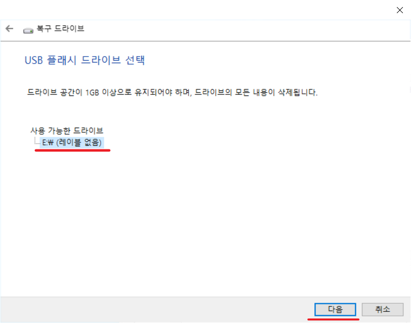 부팅디스크로 만들 USB를 선택하고 다음을 누릅니다.