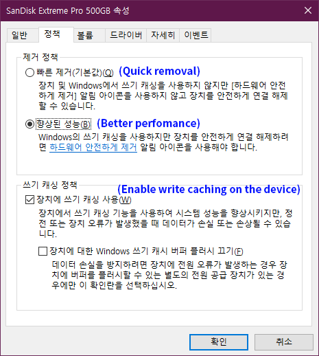 Disk write caching Enable 상태는 장치 관리자 디스크 속성에서 아래와 같이 설정한 상태를 의미합니다.