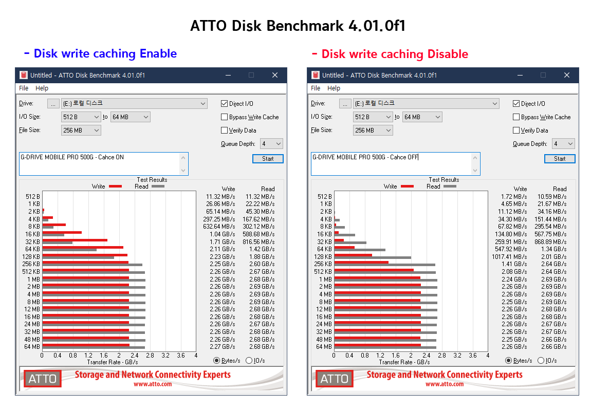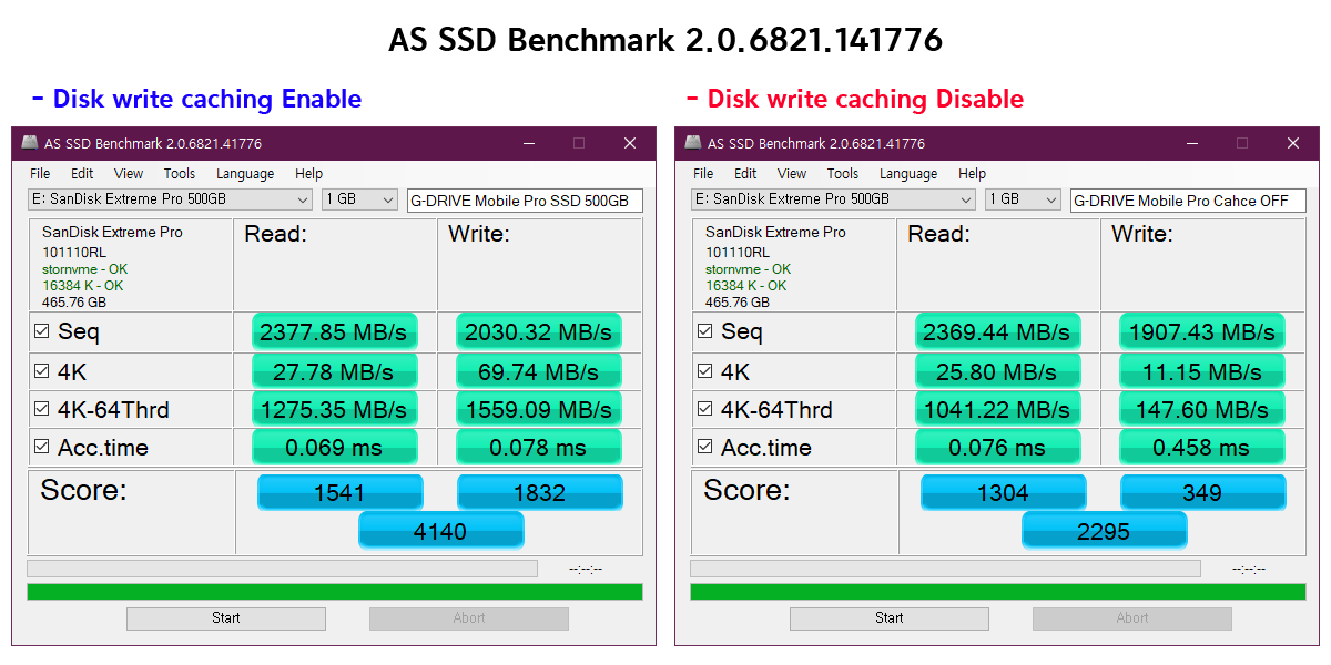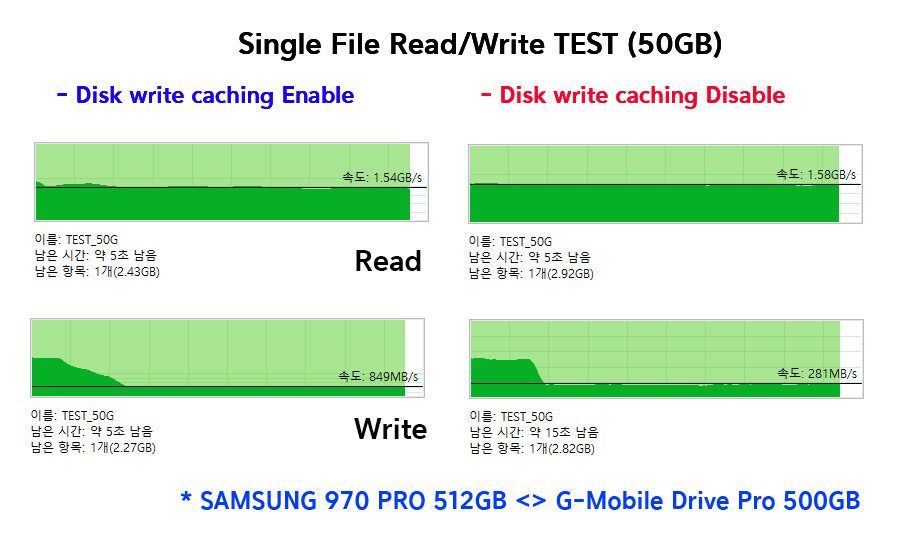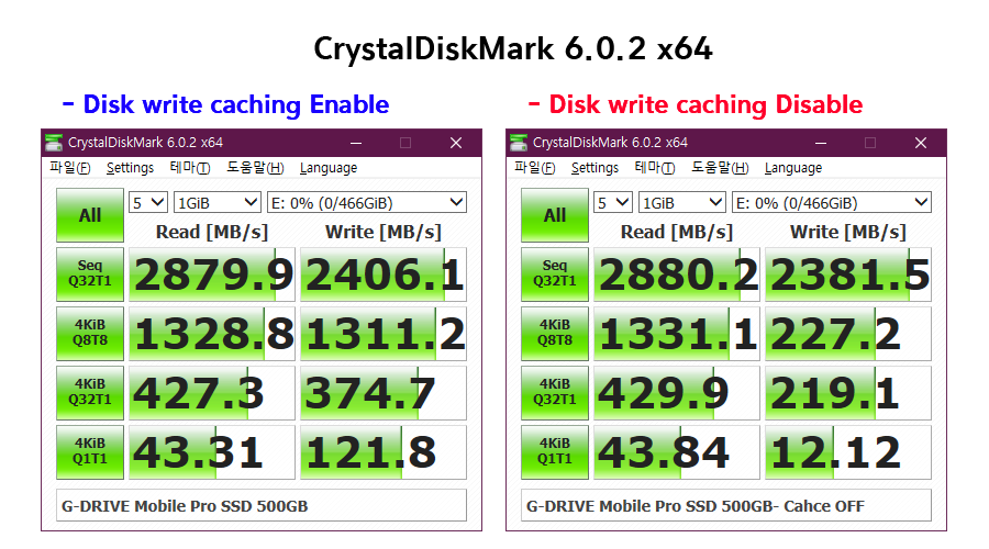 결론적으로 보면 장치에 쓰기 캐싱 사용 (Disk write caching Enable) 상태와 비교했을 때