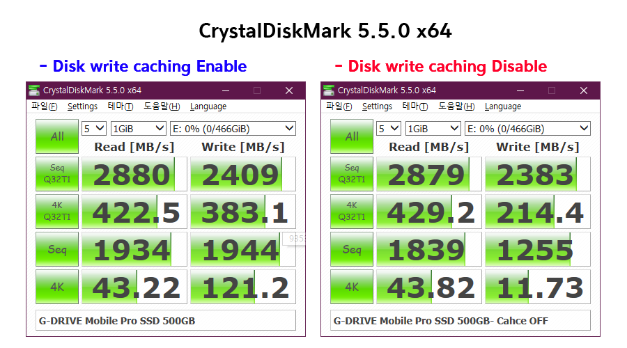 결론적으로 보면 장치에 쓰기 캐싱 사용 (Disk write caching Enable) 상태와 비교했을 때