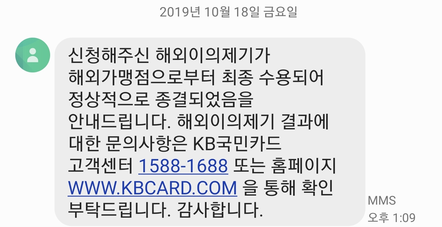 국민카드를 통해 국제브랜드사 규정에 따라 결제승인 후 14일이 지난 7월 17일 이의제기를 접수했습니다.