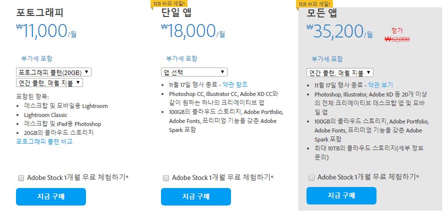 Adobe Creative Cloud 제품을 11.11 세일로 11월 17일까지 할인 판매됩니다.