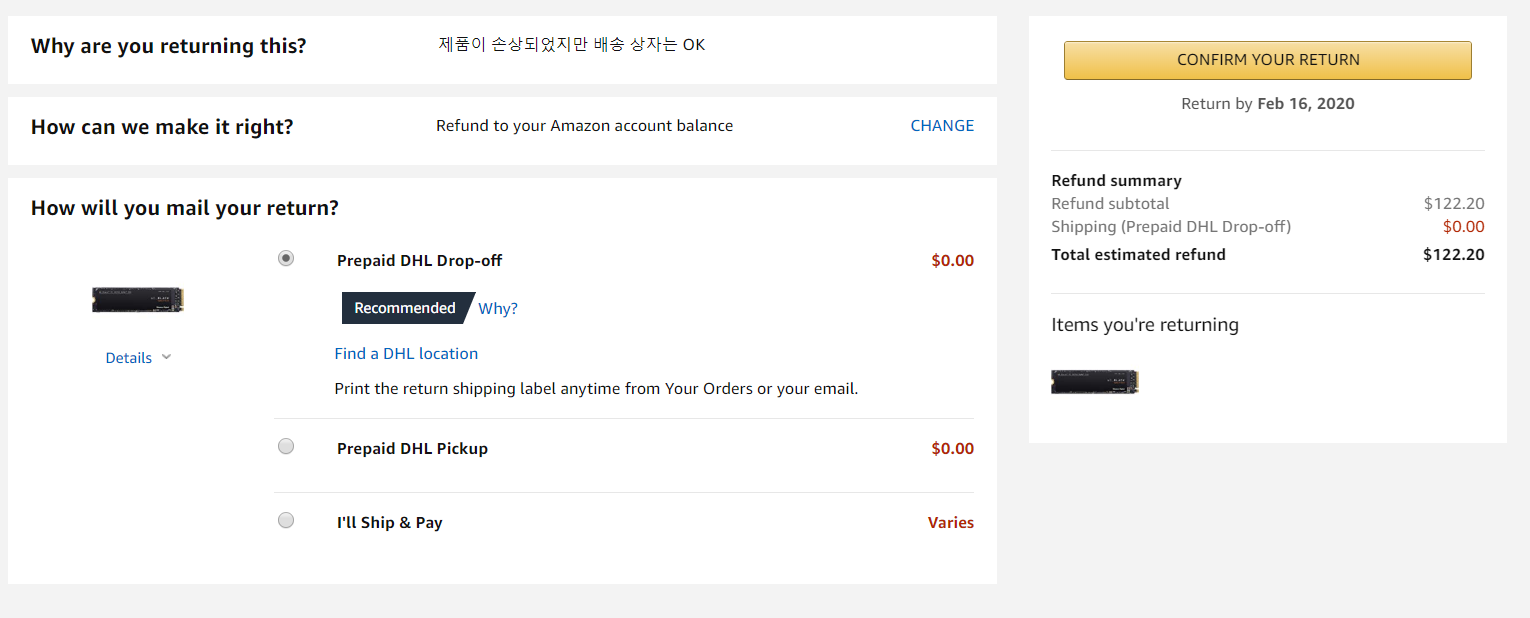 그리고 반품/교환을 결정하게 되면 DHL Drop-Off/ DHL Pickup / I'll Ship & Pay 옵션을 제공합니다.