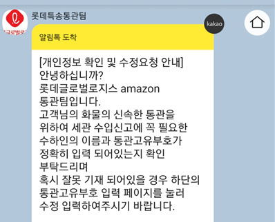 롯데 글로벌 로지스에서 개인통관 고유부호 입력 안내가 도착합니다.