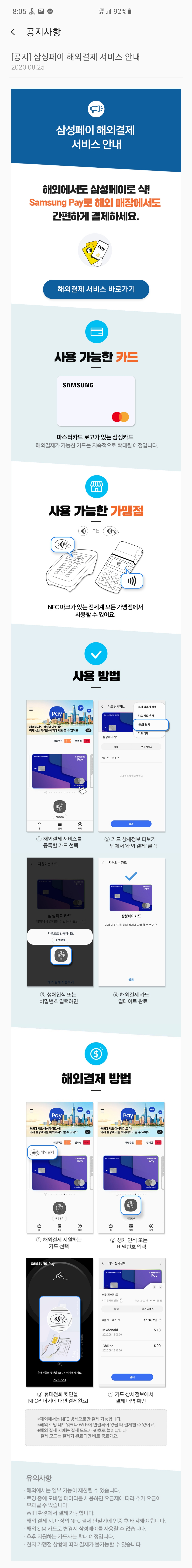 2020년 8월 업데이트를 통해 삼성 페이 해외 결제 서비스가 오픈되었습니다.