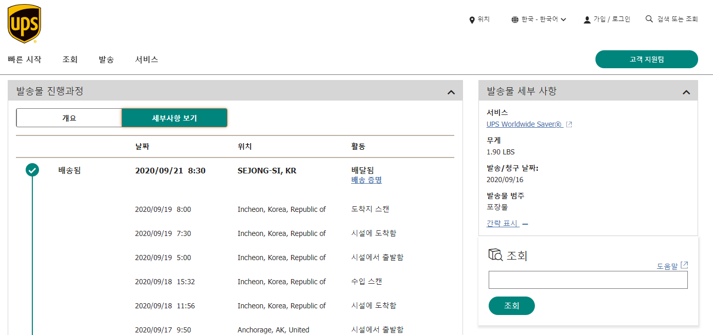 로그인 후 송장 조회를 하면 아래와 같이 발송물 세부사항에 정보가 더 많이 보이는 것을 확인할 수 있습니다.