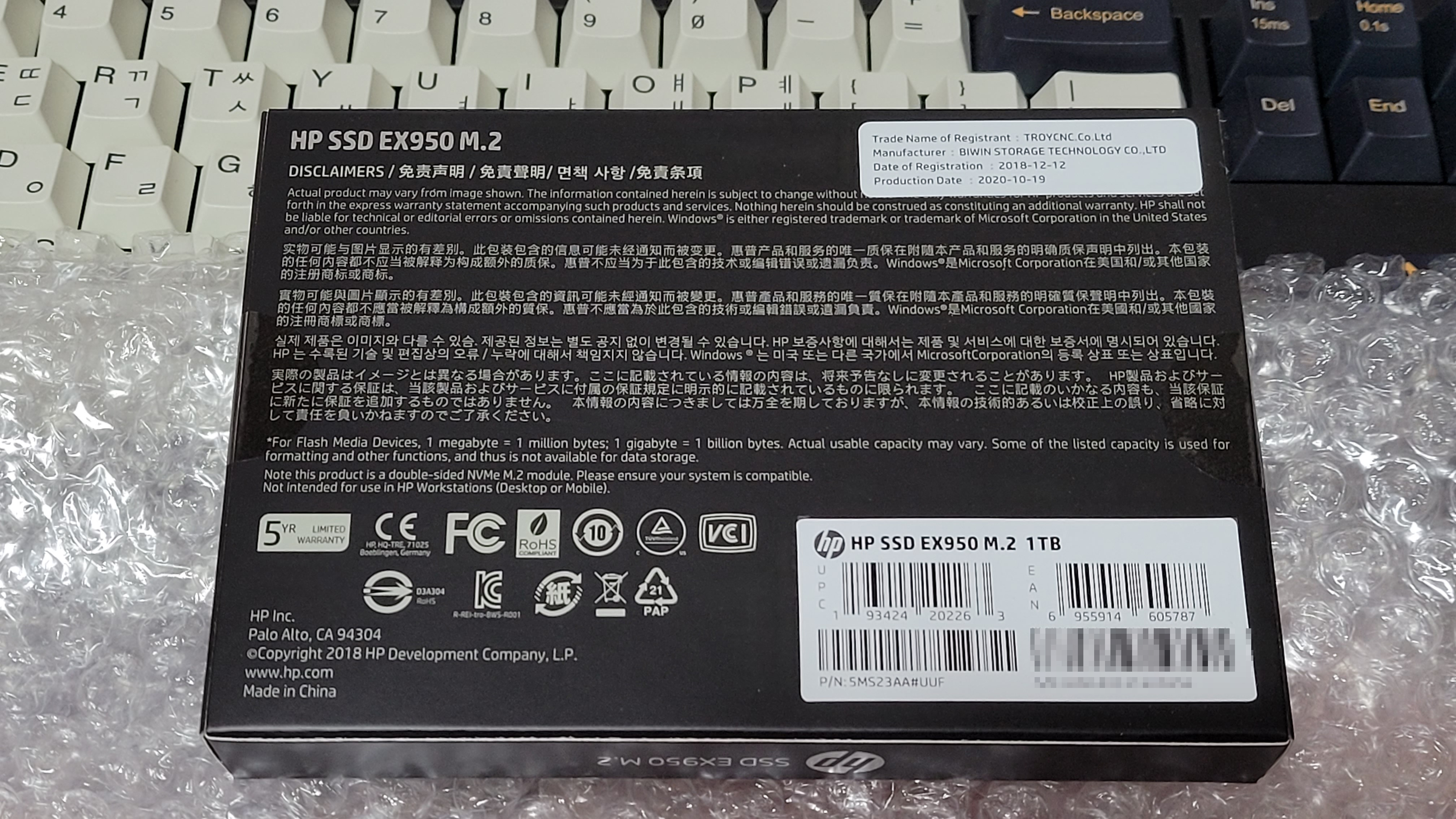 이번 빅스마일데이때 삼성카드 추가할인을 적용하여 12.7만원에 구매한 HP EX950 M.2 NVME SSD 1TB 입니다.