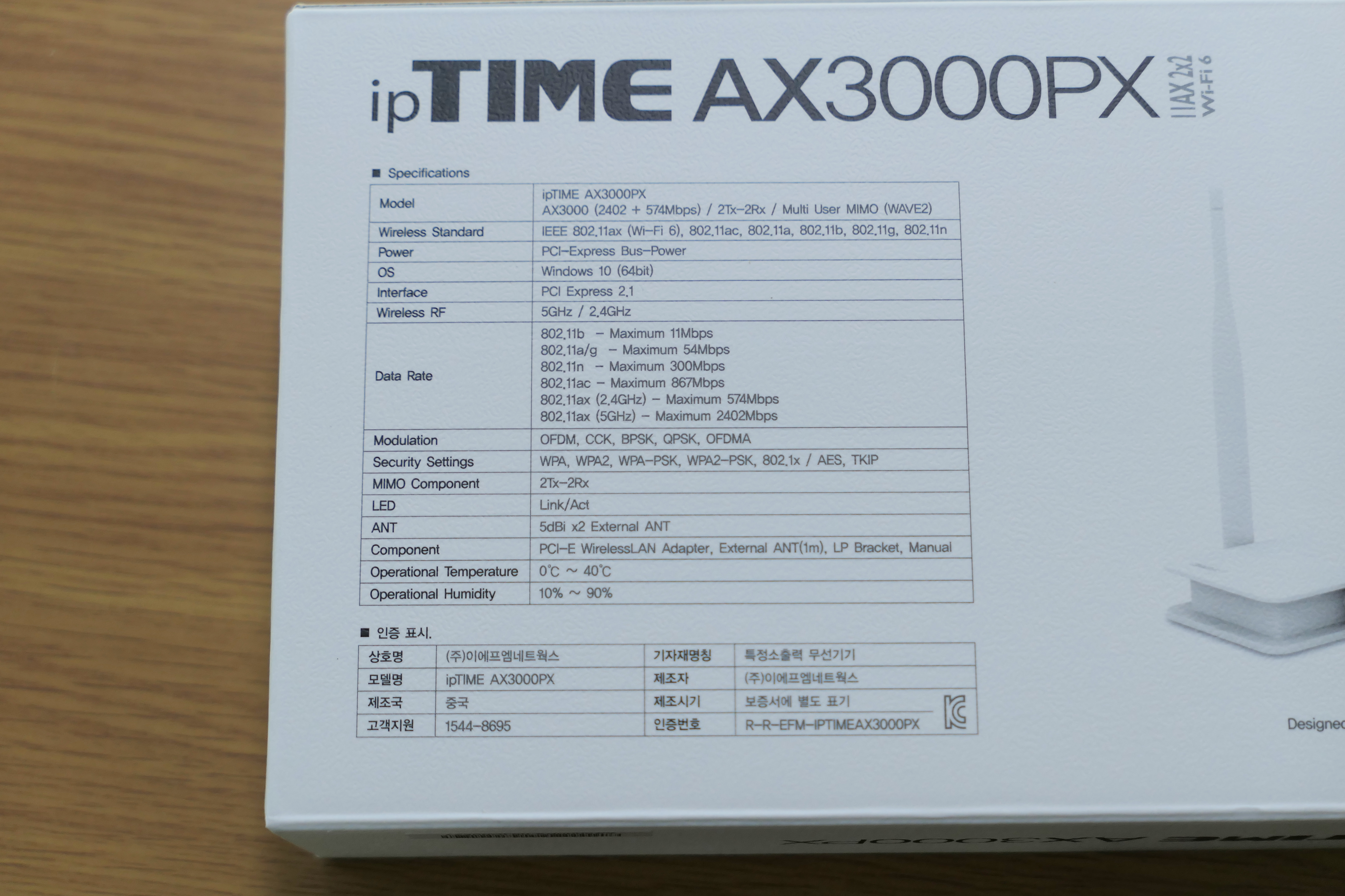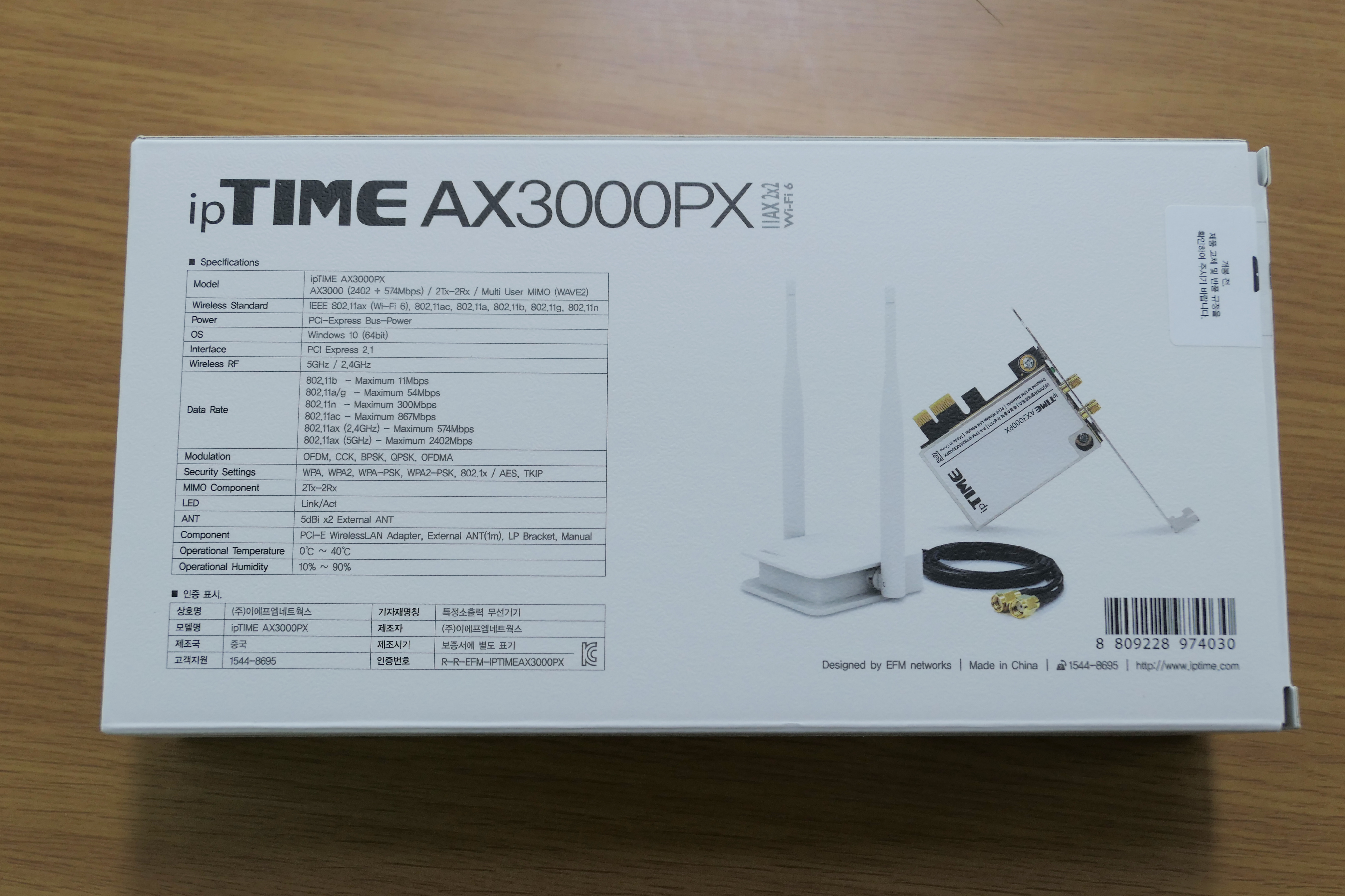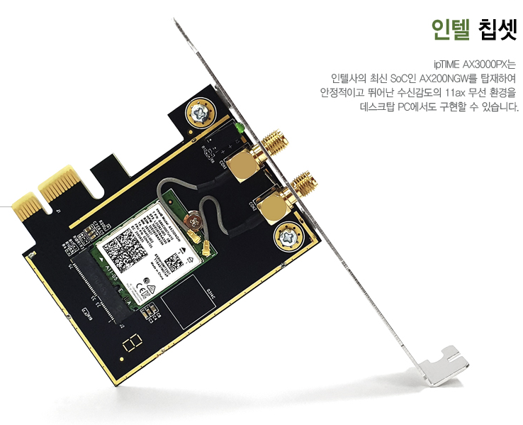 ipTIME에서 출시한 Wi-Fi 6 (802.11ax)에 대응하는 내장형 무선랜카드입니다.
