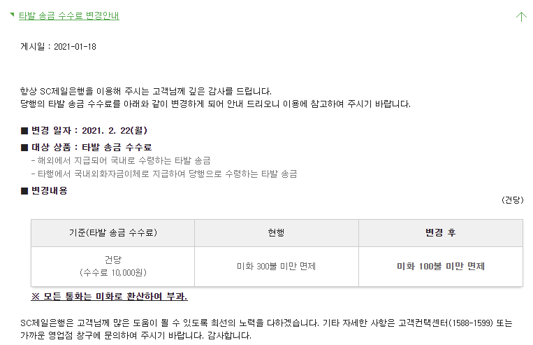SC제일은행의 타발 송금 수수료 면제 기준이 2021년 2월 22일(월)부터 기존 300$ 미만에서 100$ 미만으로 변경됩니다.