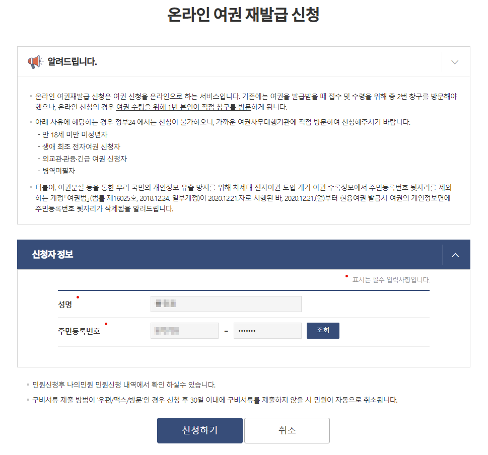 온라인 여권 재발급 신청에 들어가면 아래처럼 신청자 정보를 주민등록번호 입력으로 조회할 수 있습니다.