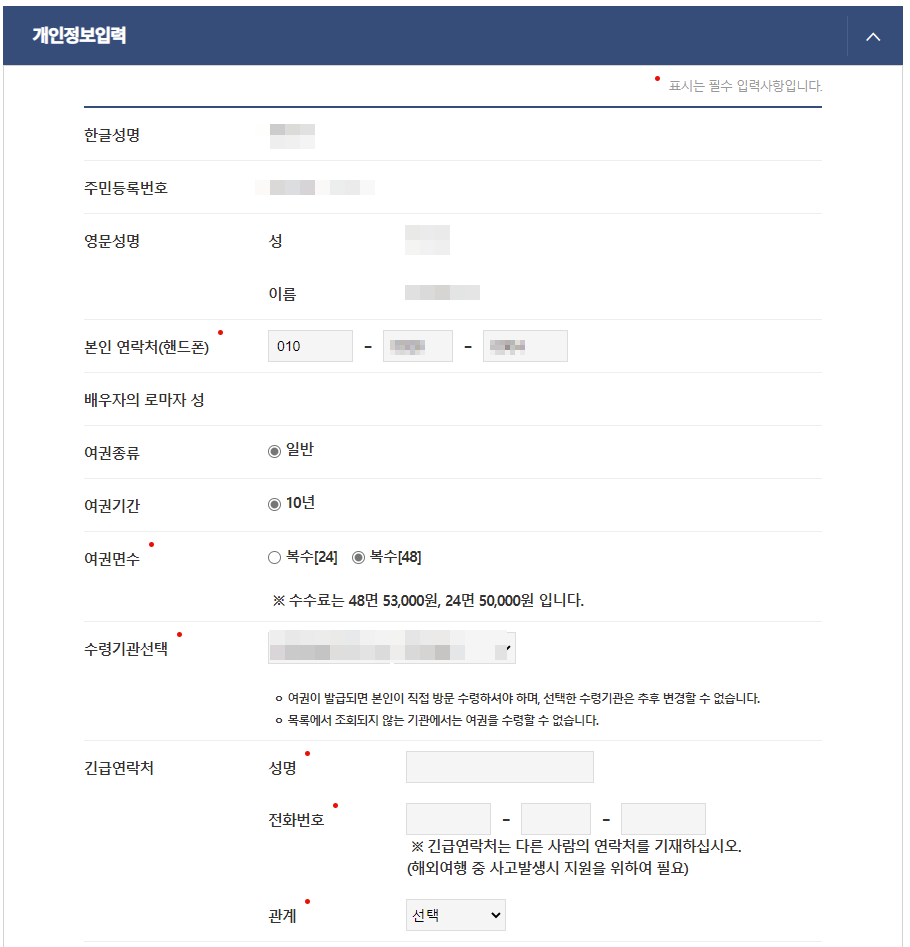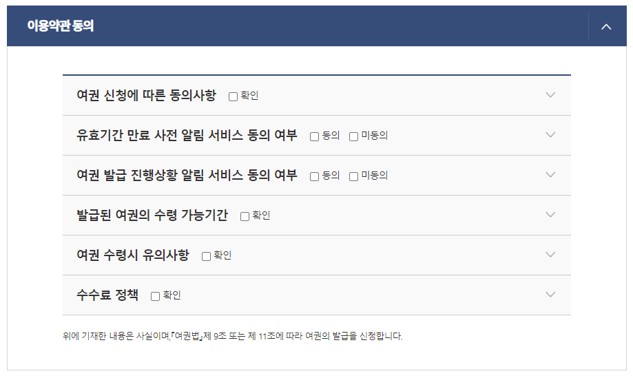 아래와 같이 여권신청에 대한 동의 후 여권 정보와 수령처를 지정할 수 있습니다.