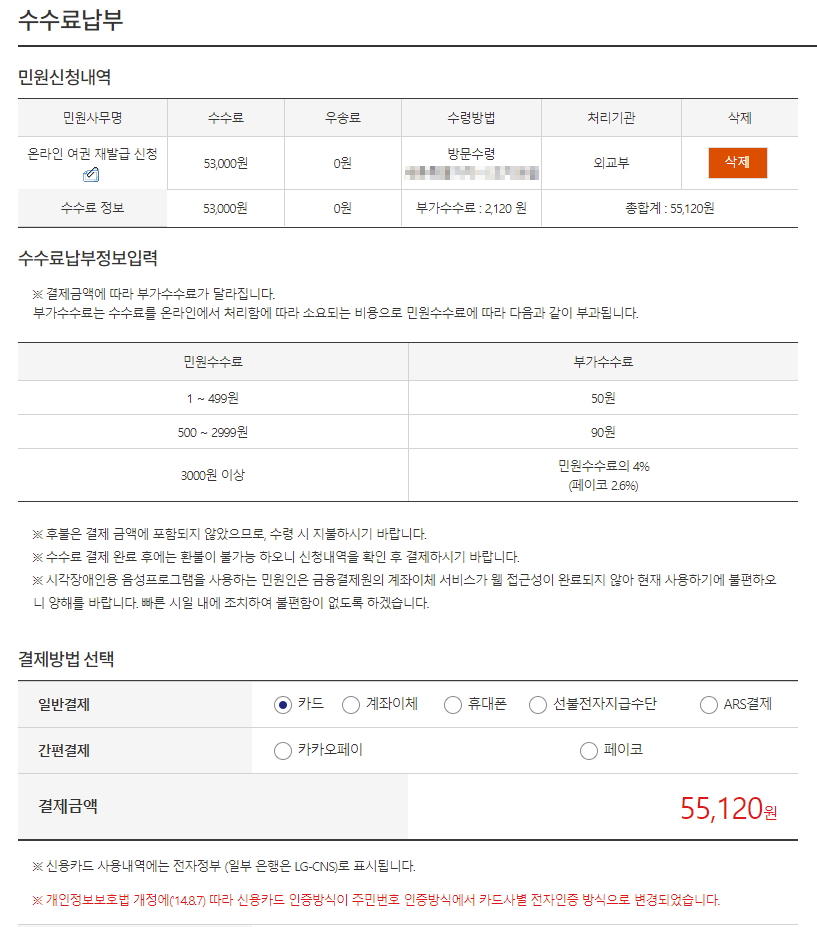 사진첨부 이후에는 수수료 납부를 진행하시고 문자메시지를 통해 교부하라는 내용이 오면 수령 기관에 방문하여 여권을 수령하시면 됩니다.