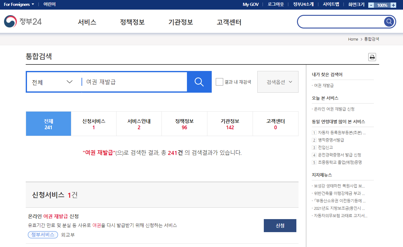 2021년 12월에 만료되는 여권이 있어 정부 24를 통해 여권 재발급을 신청하였습니다.