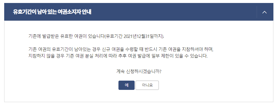 기존 유효기간이 남은 여권이 있는 경우 소지 안내가 나옵니다.