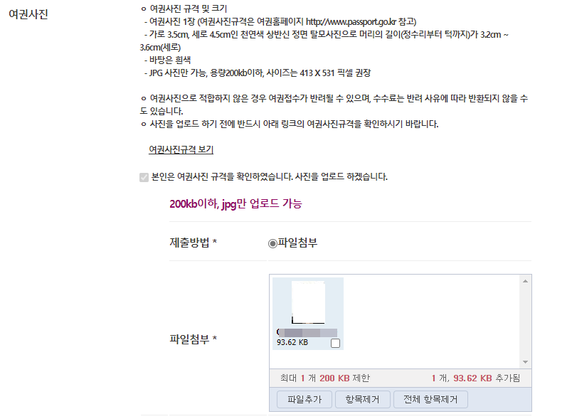 사진은 여권사진 규정에 따라 촬영된 사진이어야 하며 스캔 후