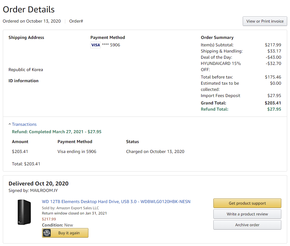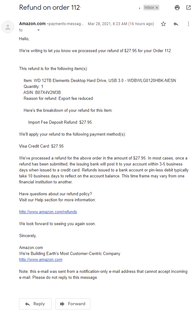 2020년 10월 13일에 구매한 WD 12TB HDD의 Import Fee Deposit 환불 이메일이 도착하였습니다.