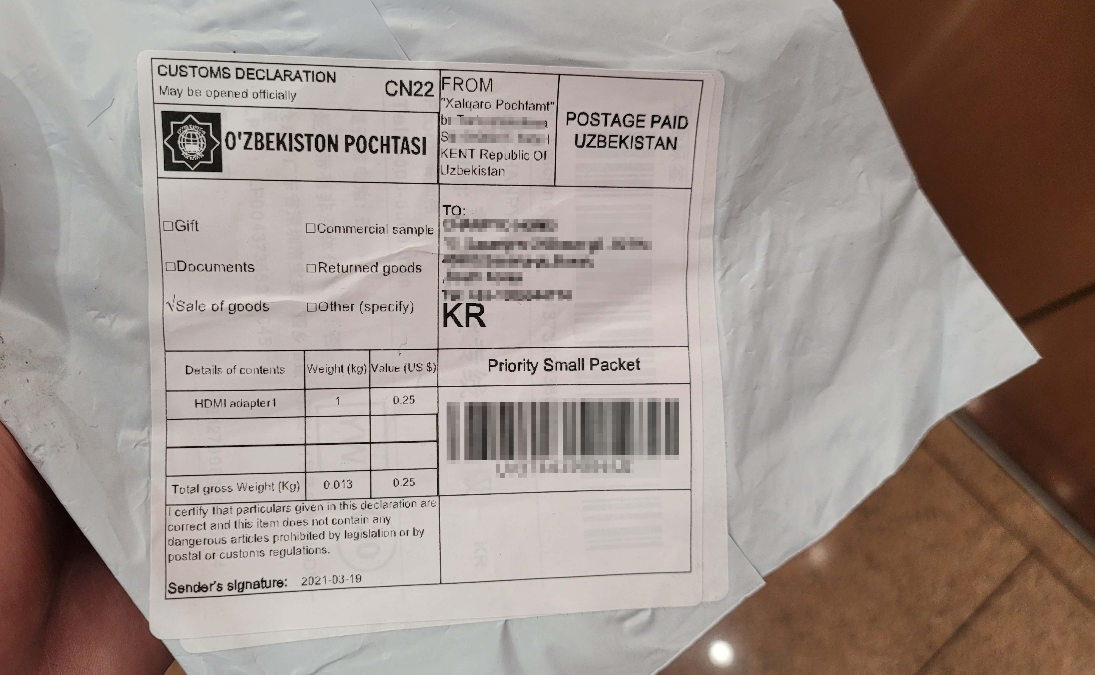 최종적으로 받은 송장에는 우즈베키스탄 우정청으로 되어있는 송장이 붙어있네요.