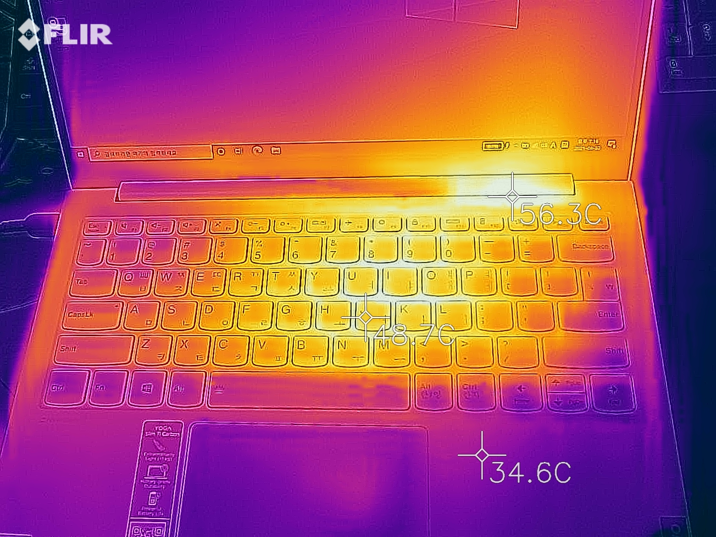 팜레스트 부분에는 34.6°C / 키보드 중앙은 48.7°C / 오른쪽 상단은 56.3°C의 측정값을 보였습니다.