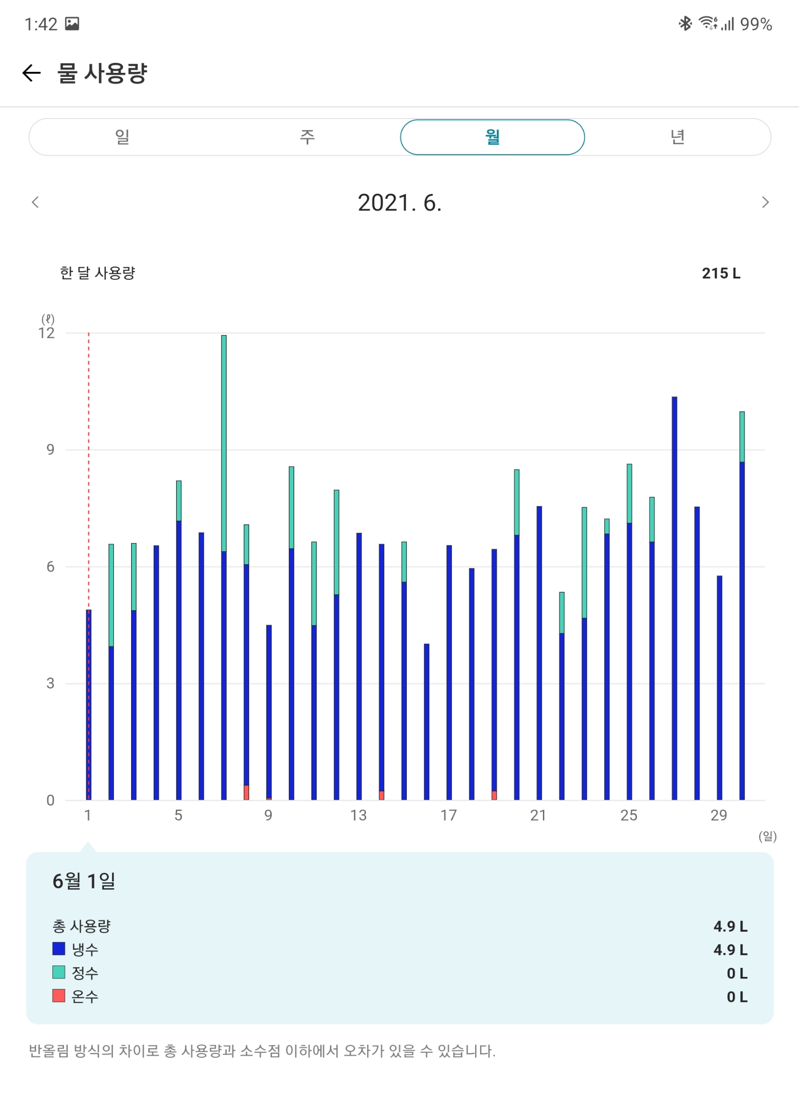 LG전자 정수기 WD503AS를 설치하고 한달동안 냉수/정수 위주로 215L를 출수한 결과 소비된 전력은 5.8kWh 였습니다.