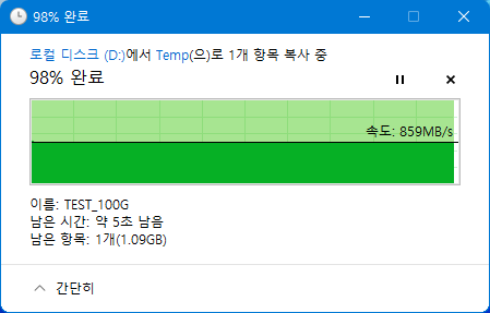 PCIe 3.0 인터페이스에 연결된 980 PRO 1TB에서 100GB 단일 파일을 전송하는 테스트입니다.