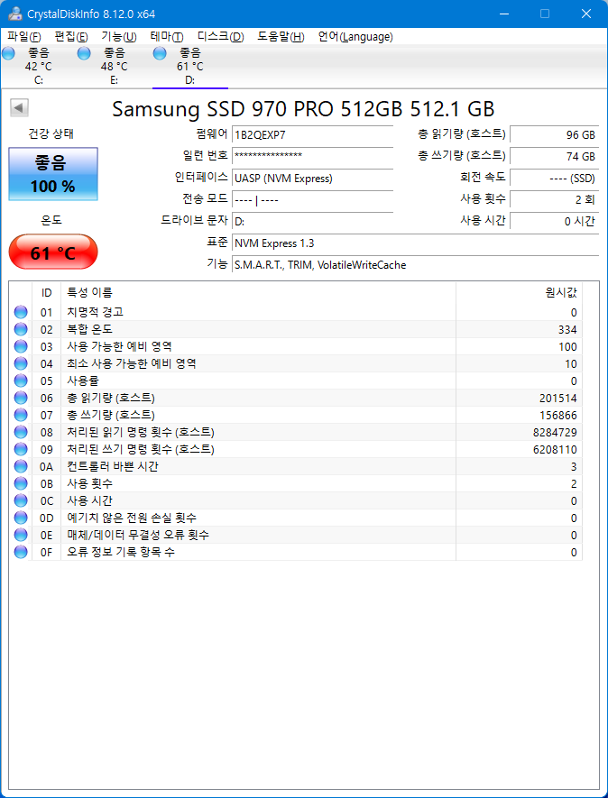 CrystalDiskMak 측정 시 최대 온도는 61'C로 나타나고 있습니다.