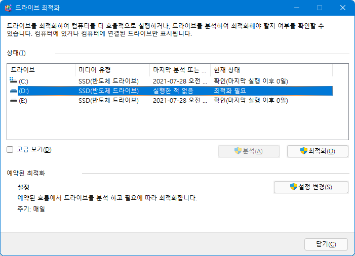드라이브 최적화 윈도 소프트웨어를 통해 SSD 최적화 (수동 트림)이 가능한 부분이 확인됩니다.