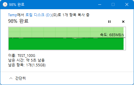 PCIe 3.0 인터페이스에 연결된 980 PRO 1TB에서 100GB 단일 파일을 전송하는 테스트입니다.
