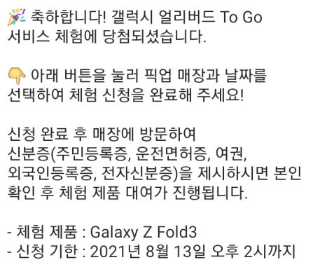 갤럭시 얼리버드 To Go 서비스 체험에 응모하고 오늘 당첨됐다는 안내를 받았습니다.