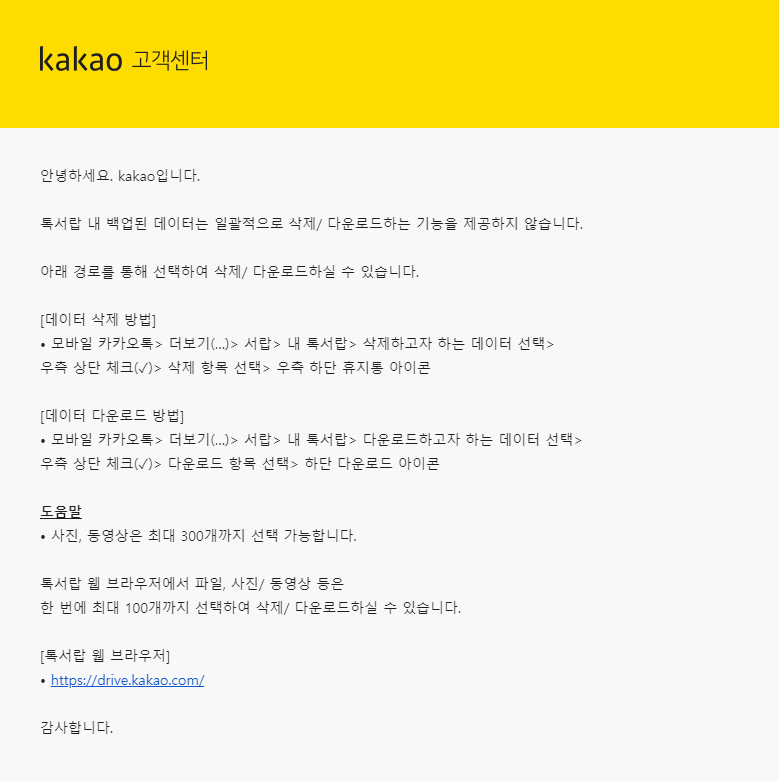 결국 일괄 삭제를 하려면 톡서랍 서비스를 해지해야되는데... 해지하면 데이터가 삭제되는게 맞는건지도 잘 모르겠네요.