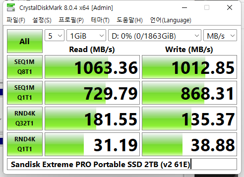 읽기/쓰기 모두 1000MB/s 이상으로 좋은 수치를 보여줍니다.