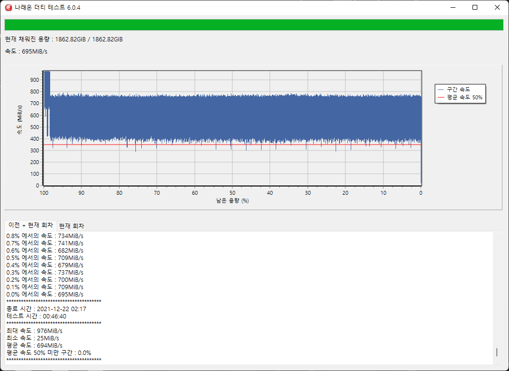 더티테스트에서는 평균 694MB/s 쓰기속도를 보여줍니다.
