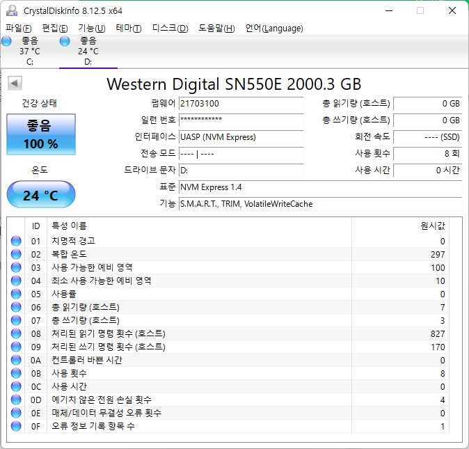 SMART상으로 인식된 정보는 tom's HARDWARE의 정보대로 SN550 기반인것으로 확인됩니다.