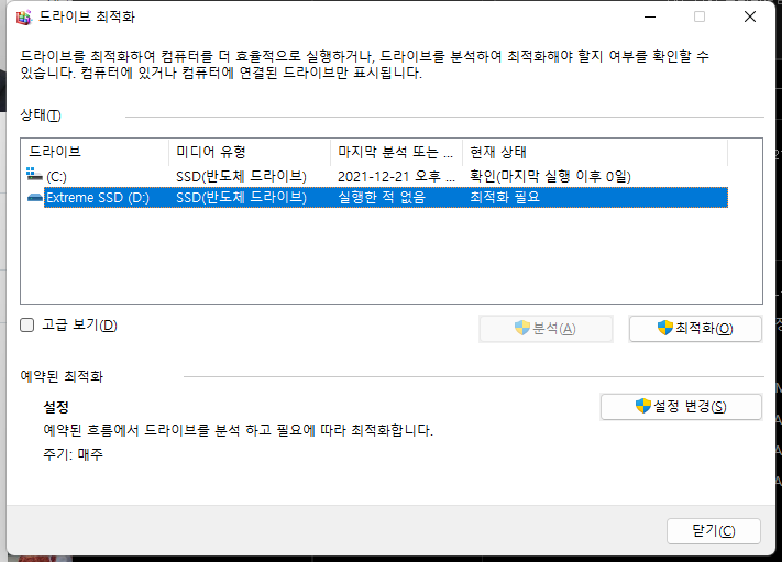 TRIM이 동작하며 윈도우 드라이브 최적화 기능을 제공합니다.