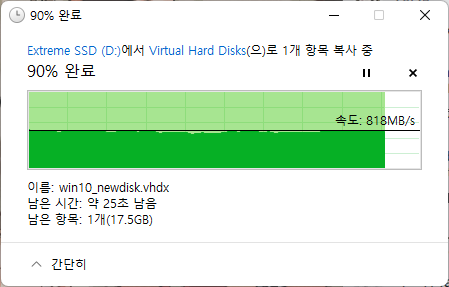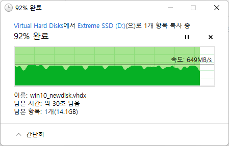 아래는 약 200GB 의 vhdx 단일파일을 복사한 성능입니다.