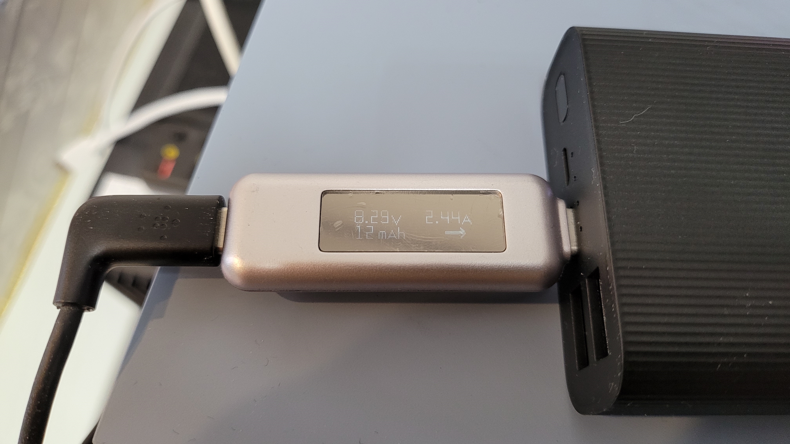 삼성 25W PPS 충전기로 보조배터리 충전 시 8.29V 2.44A 약 20W 정도로 충전되는 모습입니다.