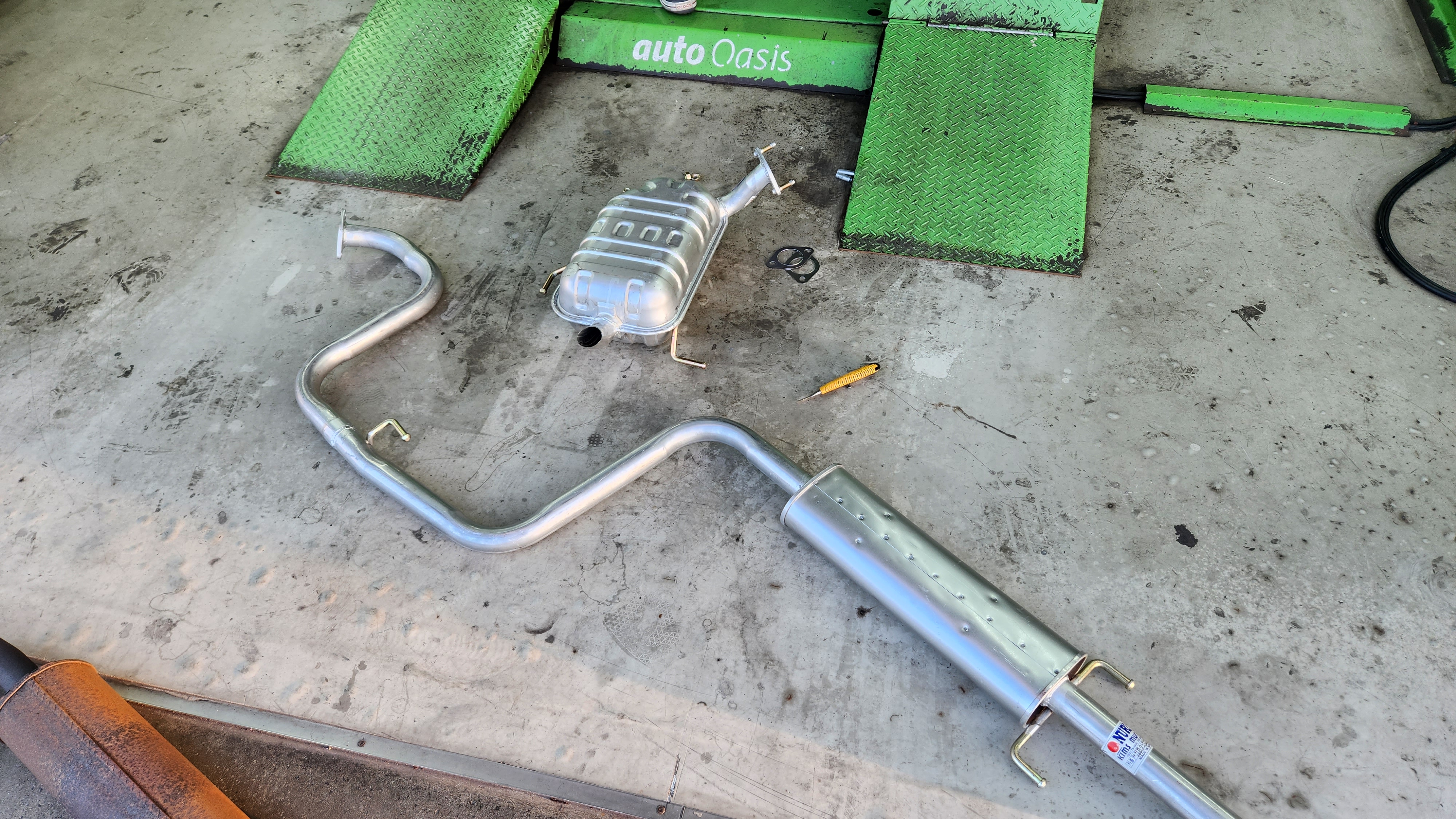 공업사 가서 어제 소음기를 중간부분과 뒷부분까지 교체하였습니다.